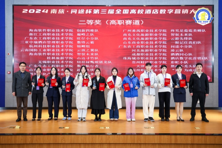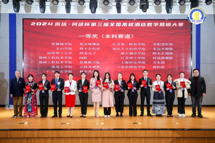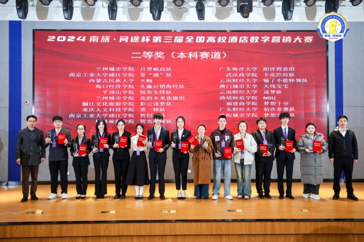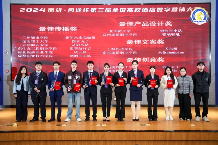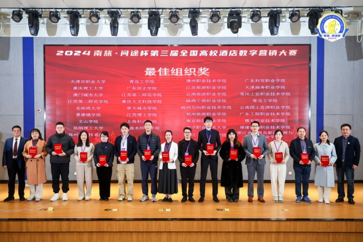 12月4日至12月7日,2024“南旅•问途杯”第三届全国高校酒店数字营销大赛决赛在南京旅游职业学院成功举办。本次大赛以“拥抱产业数字化变革,智创未来、成就自我”为主题,由中国旅游饭店业协会人力资源分会、南京旅游职业学院、广州市问途信息技术有限公司主办,南京旅游职业学院、广州市问途信息技术有限公司承办,来自全国的55所院校,69支本科及高职队伍齐聚一堂,共同角逐决赛的桂冠。南京旅游职业学院获得最佳组织奖,由酒店管理学院史晓兰老师指导的未免champion团队获得特等奖及单项奖最佳文案奖。
