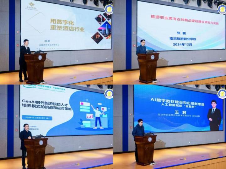 12月6日晚,“新质生产力驱动的旅游教育数字化转型与产教融合创新研讨会”在图书馆报告厅举行,学院党委委员、副院长张骏围绕“旅游职业教育在线精品课程建设研究与实践”,广州市问途信息技术有限公司董事长黄昕围绕“GenAi时代旅游院校人才培养模式的挑战和应对策略”,金陵酒店管理公司市场营销中心总经理刘勇围绕“用数字化重塑酒店行业”,北京智启蓝墨云信息技术有限公司业务总监王君围绕“Ai数字教材建设和出版新思路人工智能赋能金教材”的主题做了专题分享。之后圆桌论坛环节,由全国旅游行业指导委员会副主任、南京师范大学周春林教授主持,印圣网络科技有限公司总经理杨永彪、书香世家酒店集团运营总监金虹、凤悦酒店及度假村数智管理部总经理刘智浩、豪猪网络技术有限公司人力资源总监晏凝、南京旅游职业学院酒店管理学院院长孙爱民围绕“新质生产力赋能酒店产业发展及人才培养实践”主题分别从不同的视角进行了主题研讨。