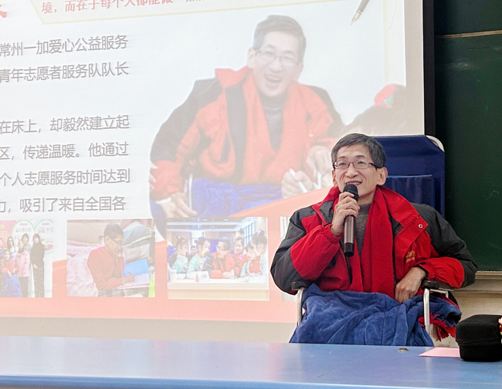 王德林现场为青年学生带来一场“志愿同心,你我同行”的主题信仰公开课。自1999年至2024年,王德林通过爱心电话,常年为300多名孤老残障人士提供日常定点服务,服务时数超过85万小时,服务群众达32万余人次,被常州市民称为当代“活雷锋”。18年前,常信院成立了首个在常高校志愿服务组织,并与一加爱心社签订协议建立了长期合作关系。18年来,10万+常信学子积极弘扬“奉献、友爱、互助、进步”志愿精神,始终以王德林的事迹和精神为榜样,将志愿精神具象化、生动化。王德林感言“公益志愿不在于一个人做多少,而在于营造公益生态环境,而在于每个人都能做一点点,人人为我,我为人人”。常信青年学生志愿者们手牵手,串起了微光,汇聚成了火炬。
