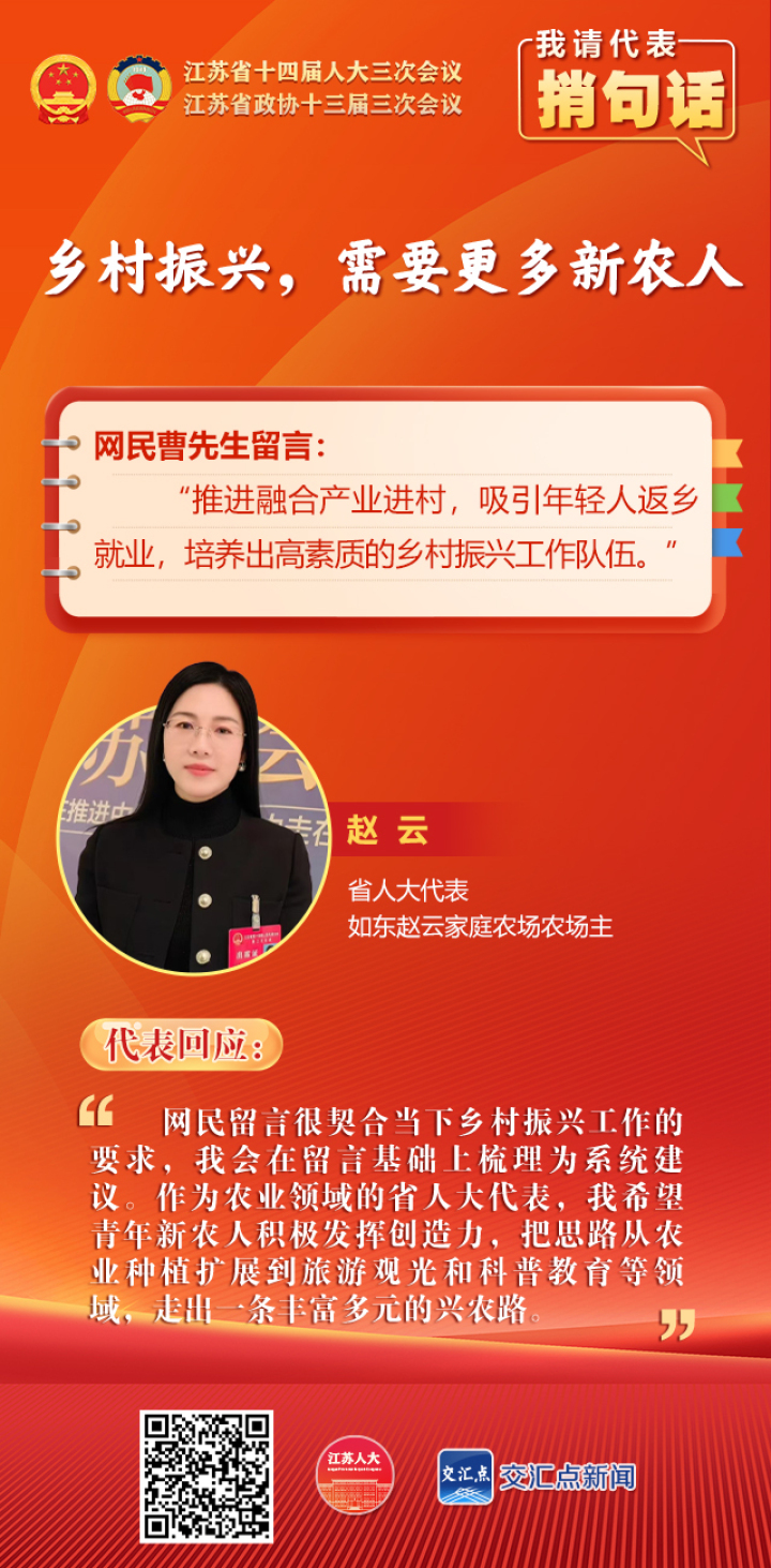 本周,2025年江苏省两会将拉开帷幕,赵云将重点关注粮食安全的保障,同时也积极吸纳网友在“我请代表捎句话”上的留言。“网民留言很契合当下乡村振兴工作的要求,我会在留言基础上梳理为系统建议,希望引导更多青年新农人用智慧为乡村振兴作贡献。”