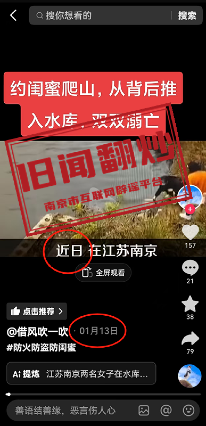 2025年1月13日,有网民在抖音、西瓜视频、微视等短视频平台发布视频,称近日南京一女子在河边系鞋带时被其同伴推下水,双双溺亡。