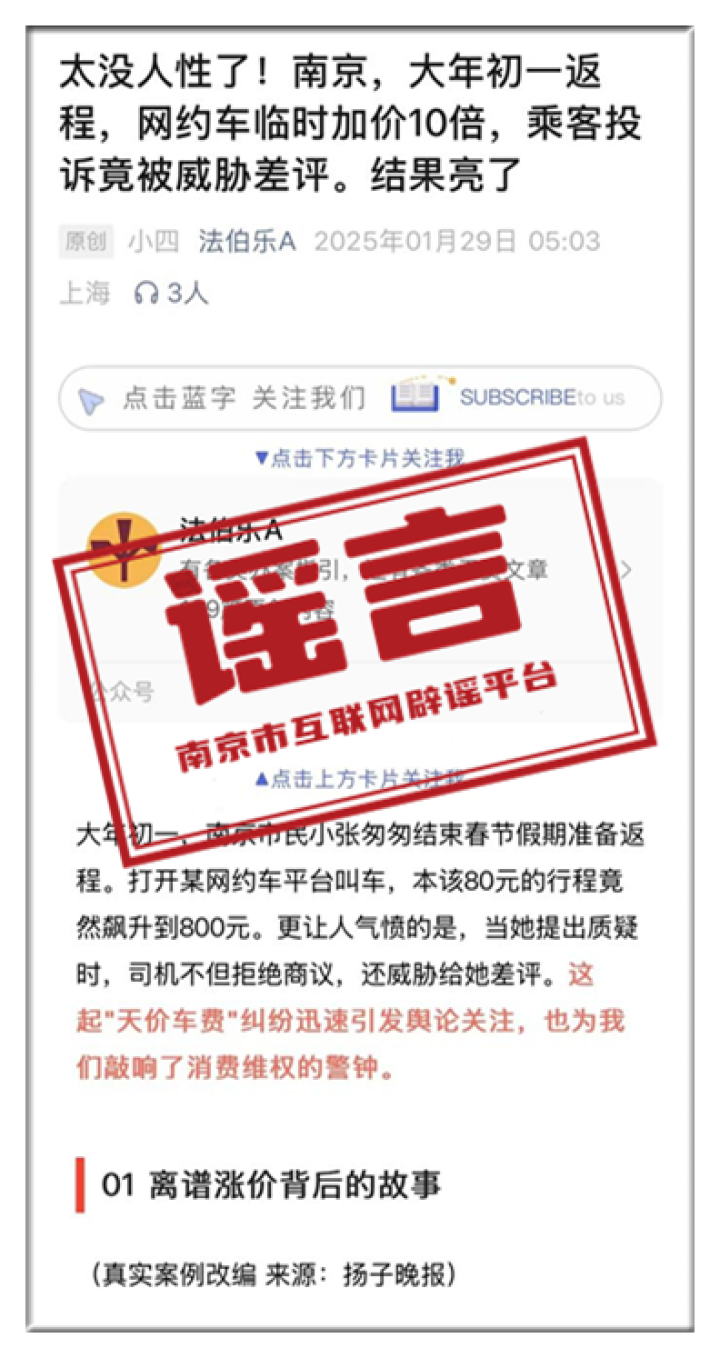 2025年1月29日,陆续有微信公众号传言,大年初一从江宁区打车前往南京南站,本该80元的行程竟然飙升到800元,并附“春节期间加价”截图,显示信息源于《扬子晚报》真实案例改编。
